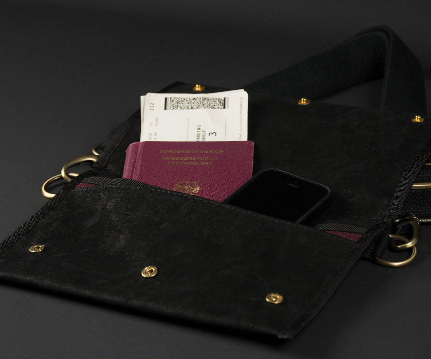 Black Cross Body Bag made of leather with adjustable black straps and high-quality metal snap-links. Space for your smartphone, wallet, keys, and everything you need, keeping them safe and easily accessible.